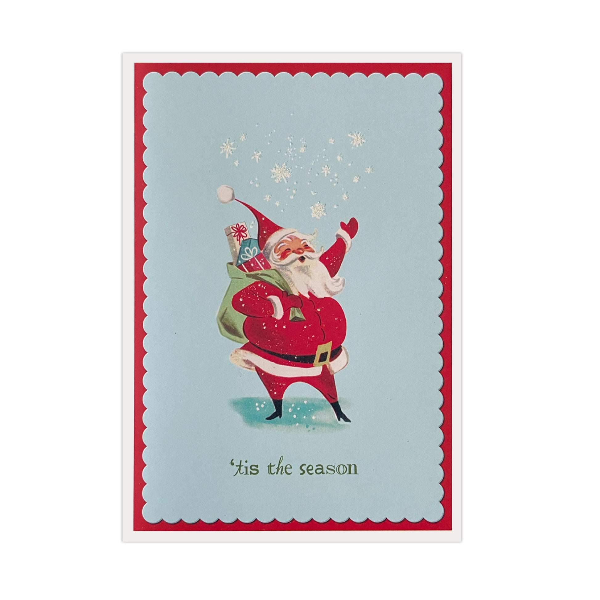 20 cards & 21 red envelopes. Embellished in light dusting of glitter snowflakes. A retro classic Santa rings in 'tis the season. Card Size: 3.5 in x 5 in. Red printed Message Inside: "Wishing you the happiest of holidays".